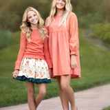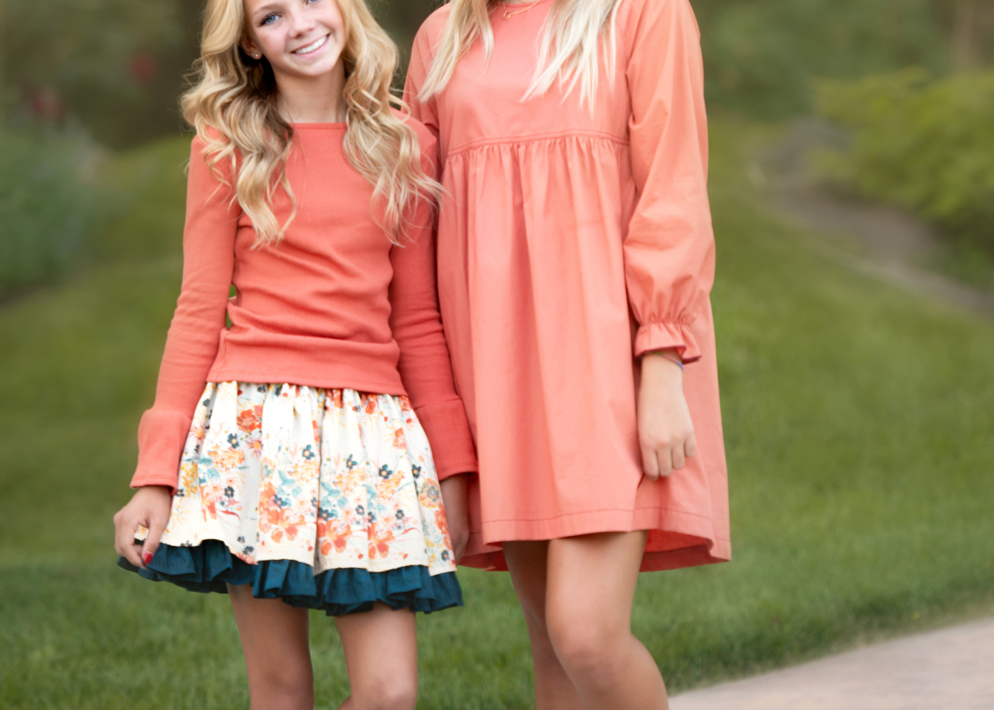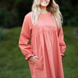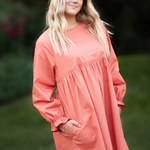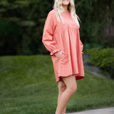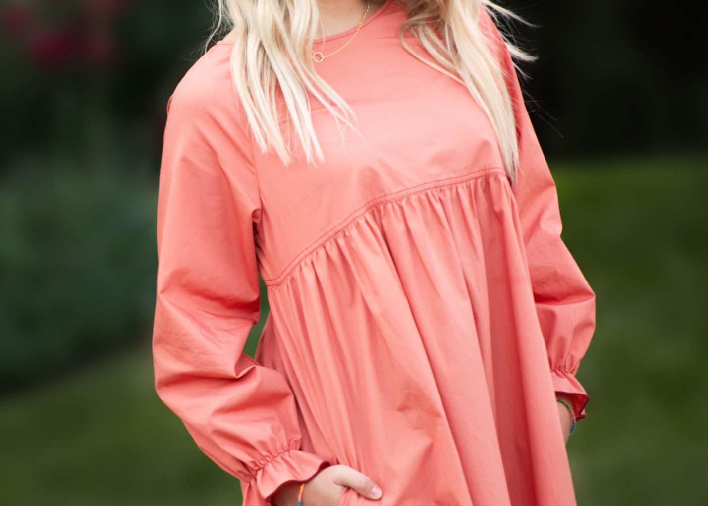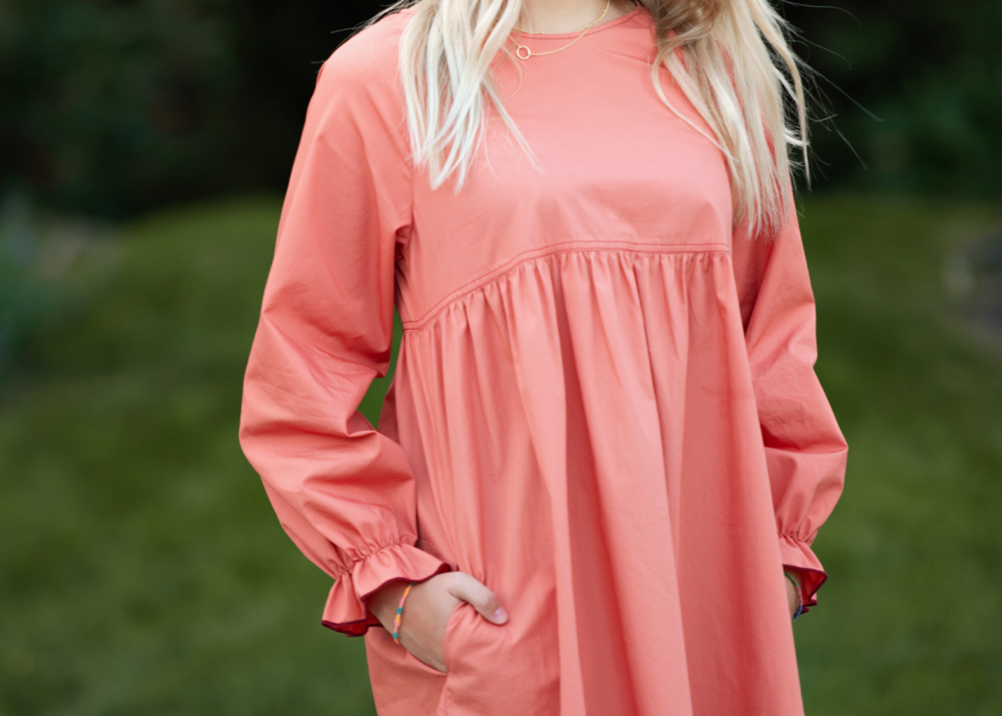 The Babydoll Dress is the perfect teen dress for the cozy fall season. This dress has a simple silhouette that has a high waist, a full gathered sleeve, in a coral color that is so feminine. We added a contrast stitch in burgundy colored thread for a fun pop and detail. This is an easy dress to wear as it has extra room and won't fit uncomfortably tight. Layer some cute leggings or wide leg pants under for a fun look on those cooler days.