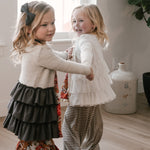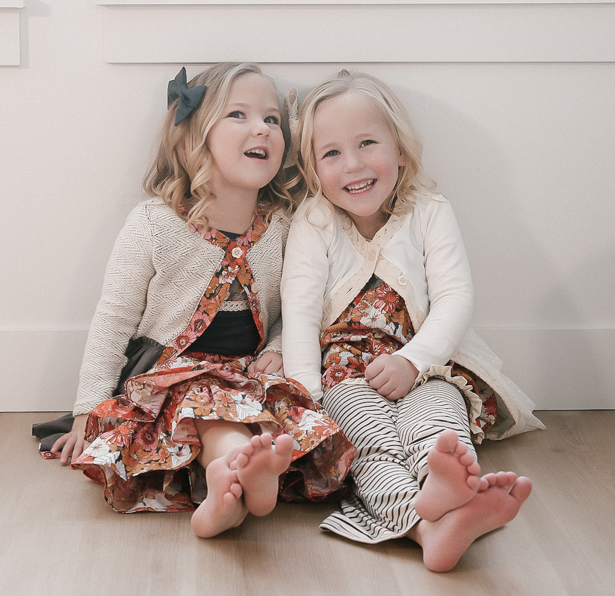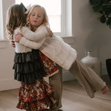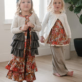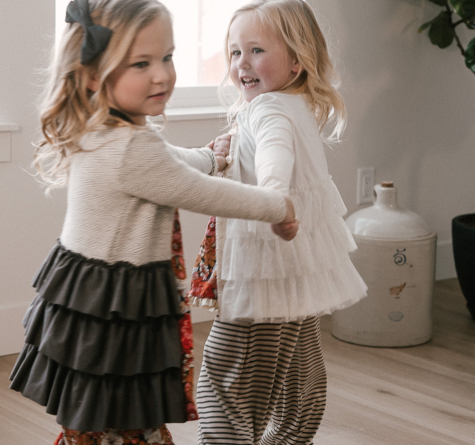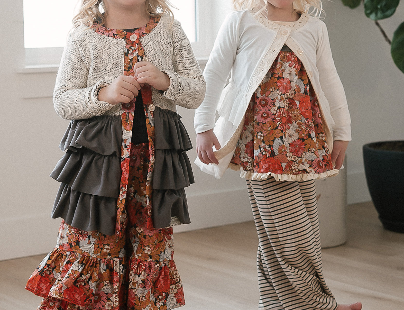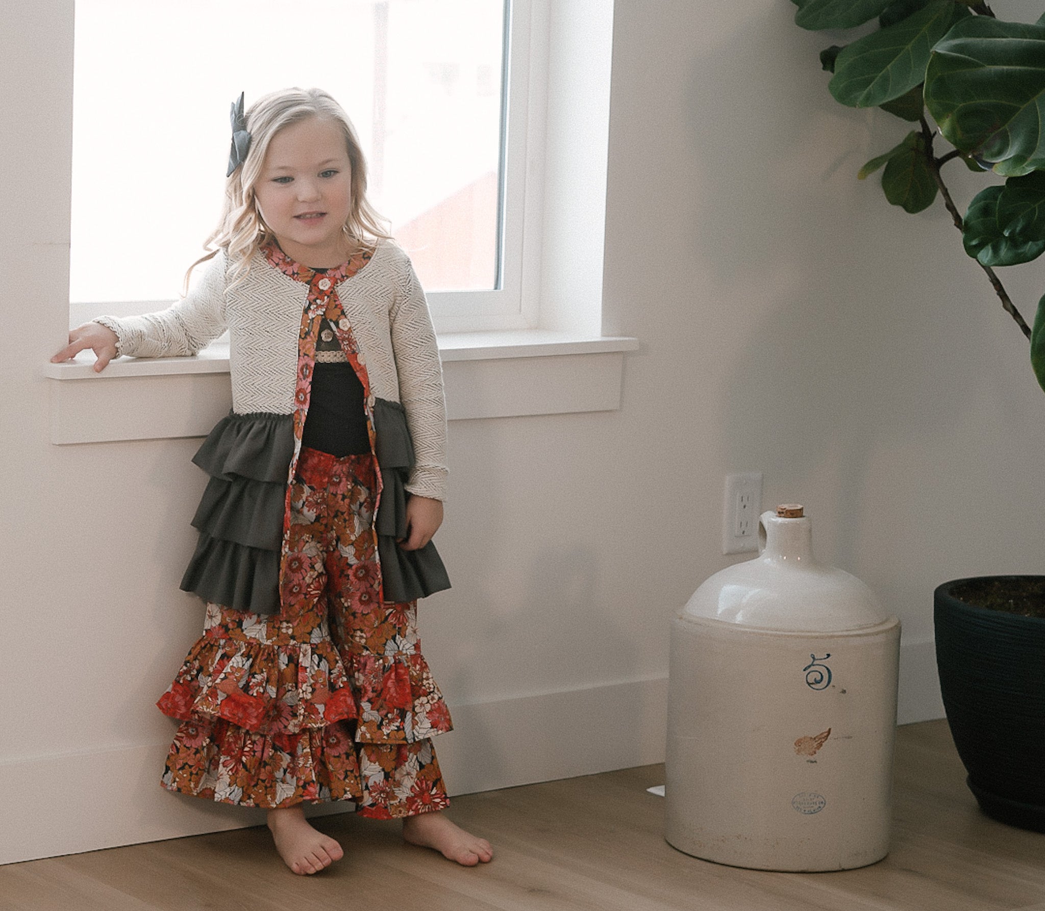 The Tess Jacket is such a fun jacket to layer over so many things in the collection. You will love this jacket! Pair with the Double Ruffle Belle Pant, Palazzo Pant, or the Erin Legging and put the Lou Lou Top, Aspyn Top, or Avery top underneath. This is made with a sweatshirt fabric that has a chevron pattern and is two toned with cream and charcoal.