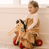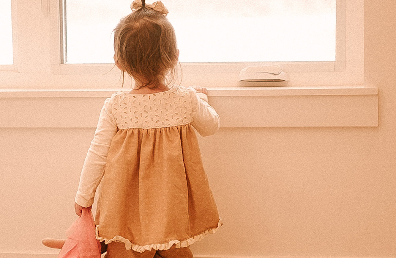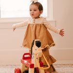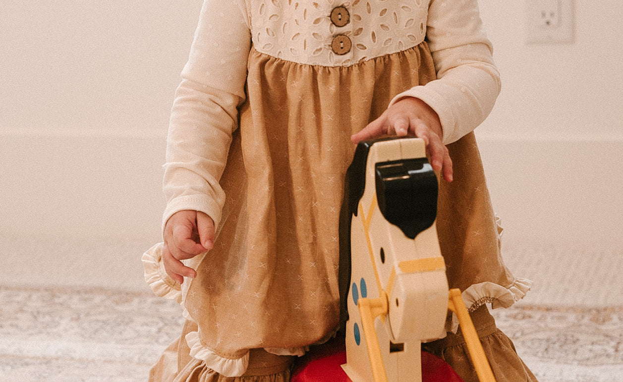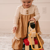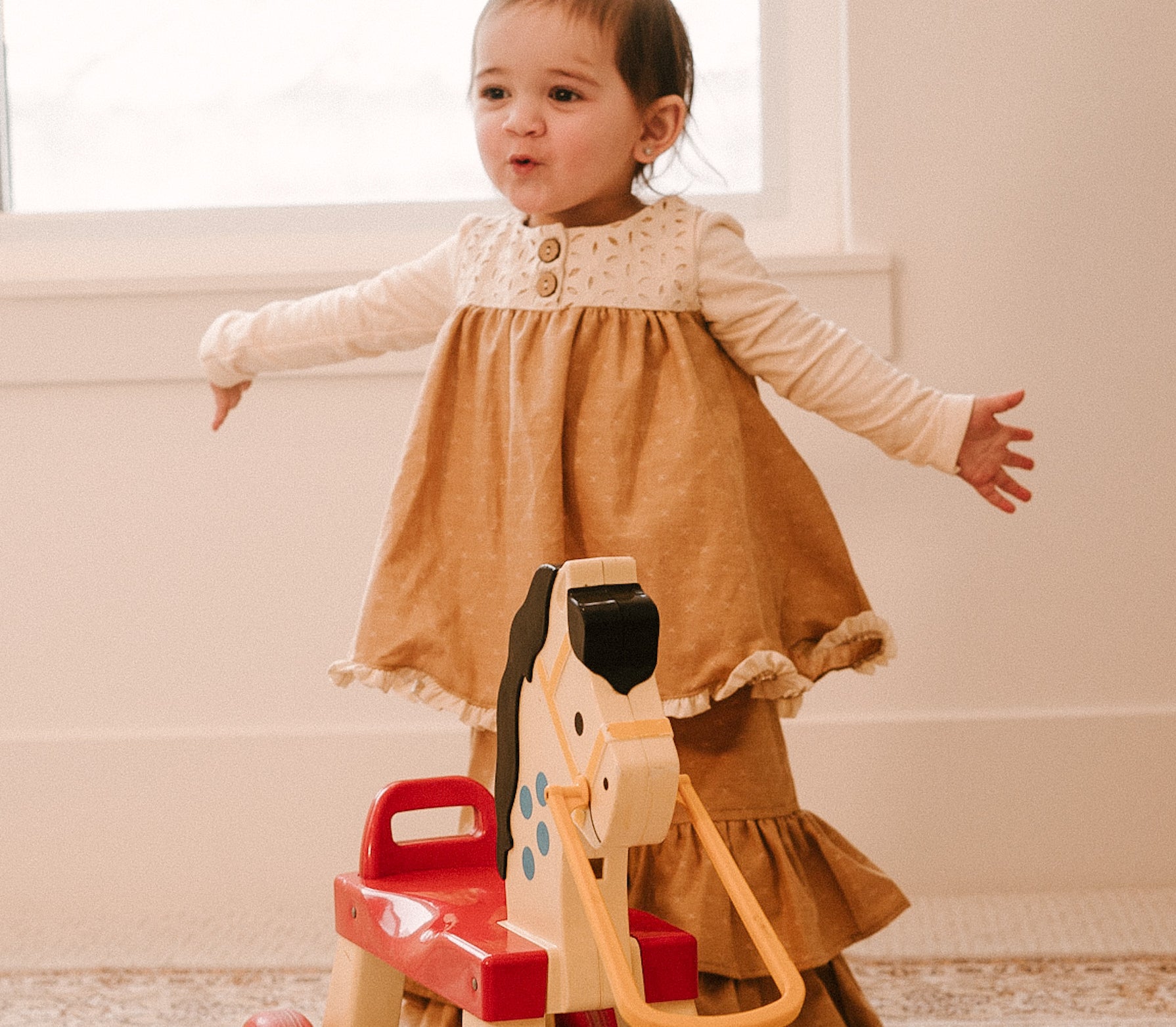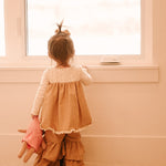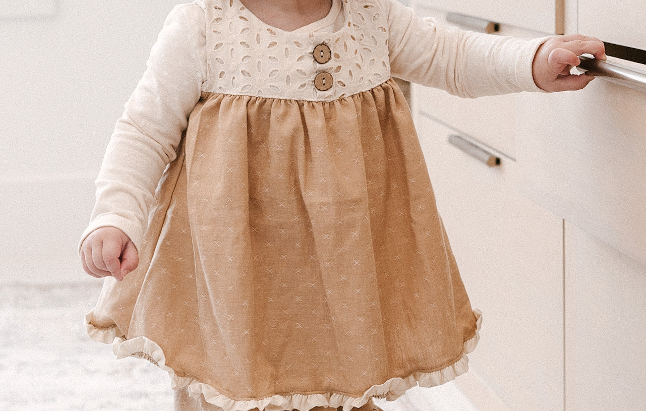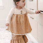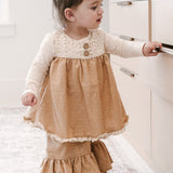 This adorable tunic has a eyelet bodice and two coconut buttons. The main dress is a woven two toned tan with and embroidered x in it. The delicate bottom ruffle is just a sweet finish for the edge. this neutral tan is vintage and classic as well as so on trend. It pairs so perfectly with our Aspyn Top, Double Ruffle Belle pant, Erin Leggings, Kenley Leggings, or Palazzo pants. Find her combination that suits her perfectly. There are so many options and you can't go wrong with any!