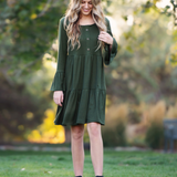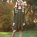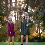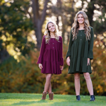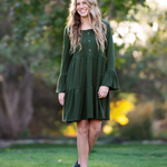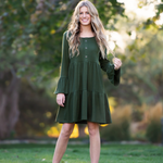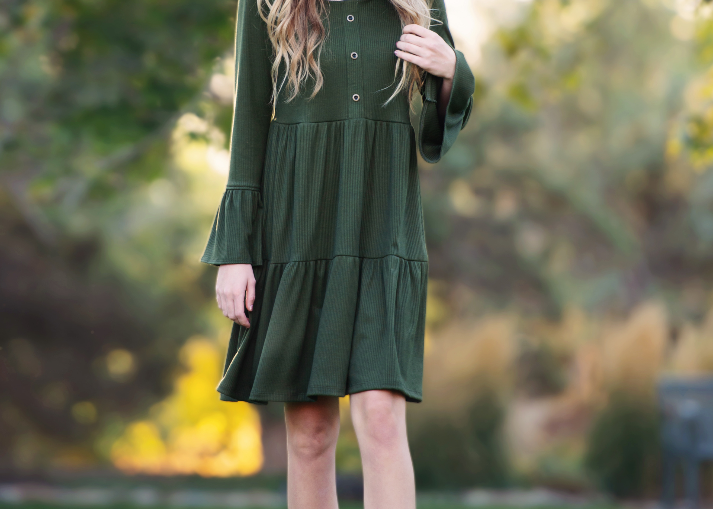 The Zoe Dress is going to be her go to dress for the fall and winter season. This beautiful pine color is so lovely for the winter months. It is so soft, so flowy, and so comfortable. It is feminine yet sophisticated. The gathered ruffle on the sleeve gives it that perfect boho feel. She can twirl in it yet it doesn't poof out making her feel like a kid but she will still feel like she can dance in it. The fabric is a ribbed stretchy knit fabric.
