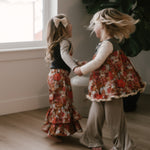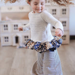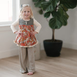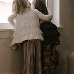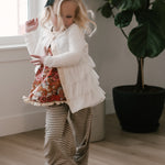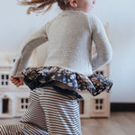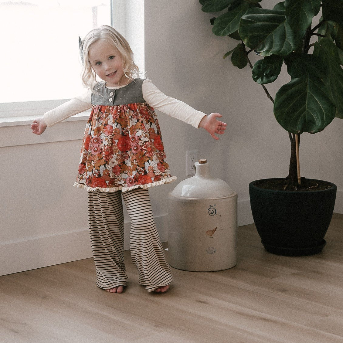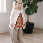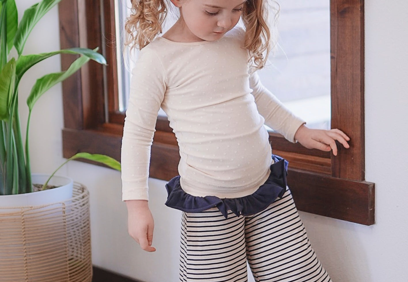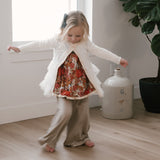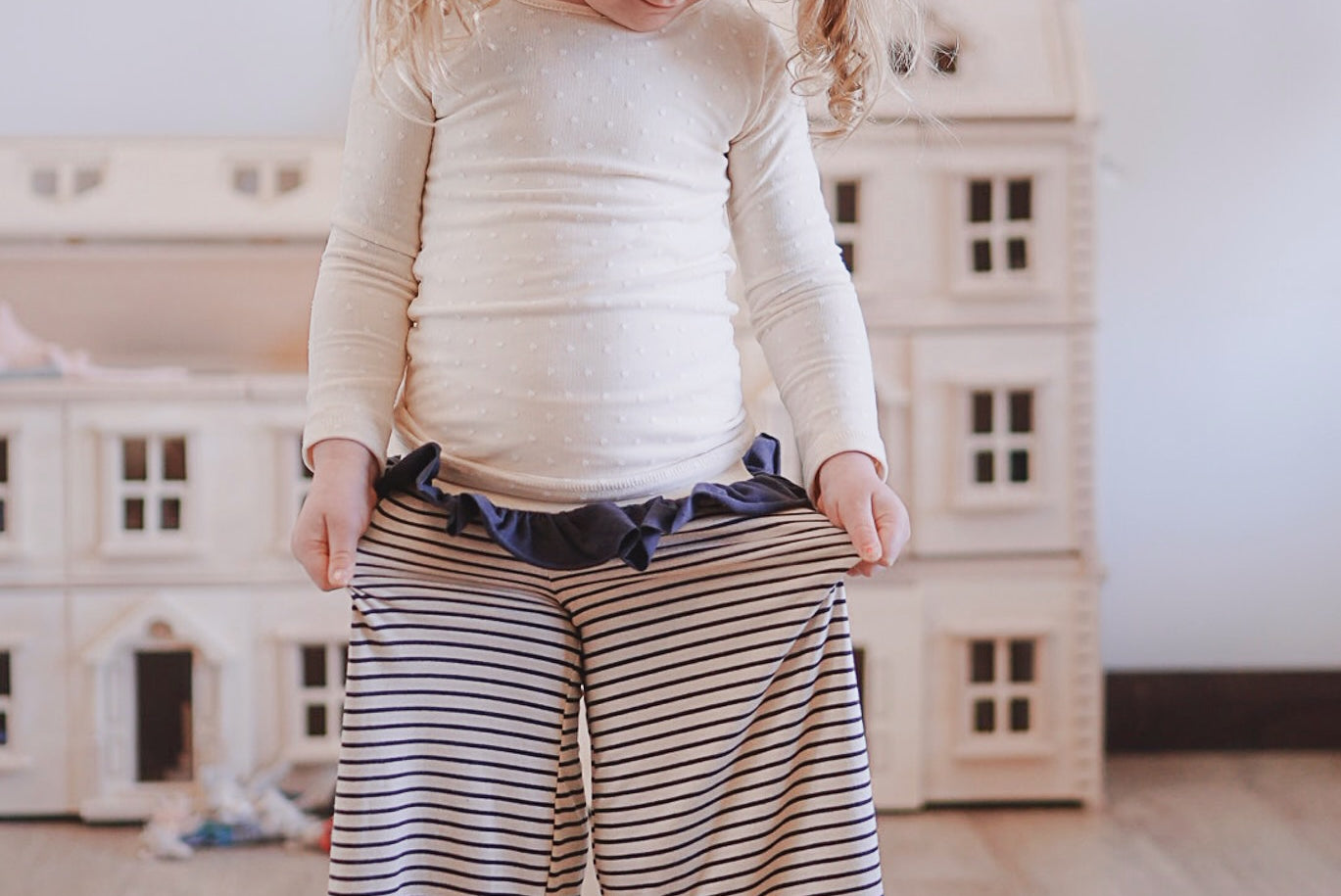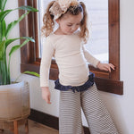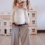 The Palazzo Pant is a personal favorite! Wide flowy leg and a big knit waist band that can be folded over, pulled up, or scrunched. It has a ruffle at the waist except for the 14 and 16 year. Pairs so well with the Lou Lou Top, Aspyn Top, Avery Top, Playdate Top, and Tess Jacket. The stripe is so adorable!