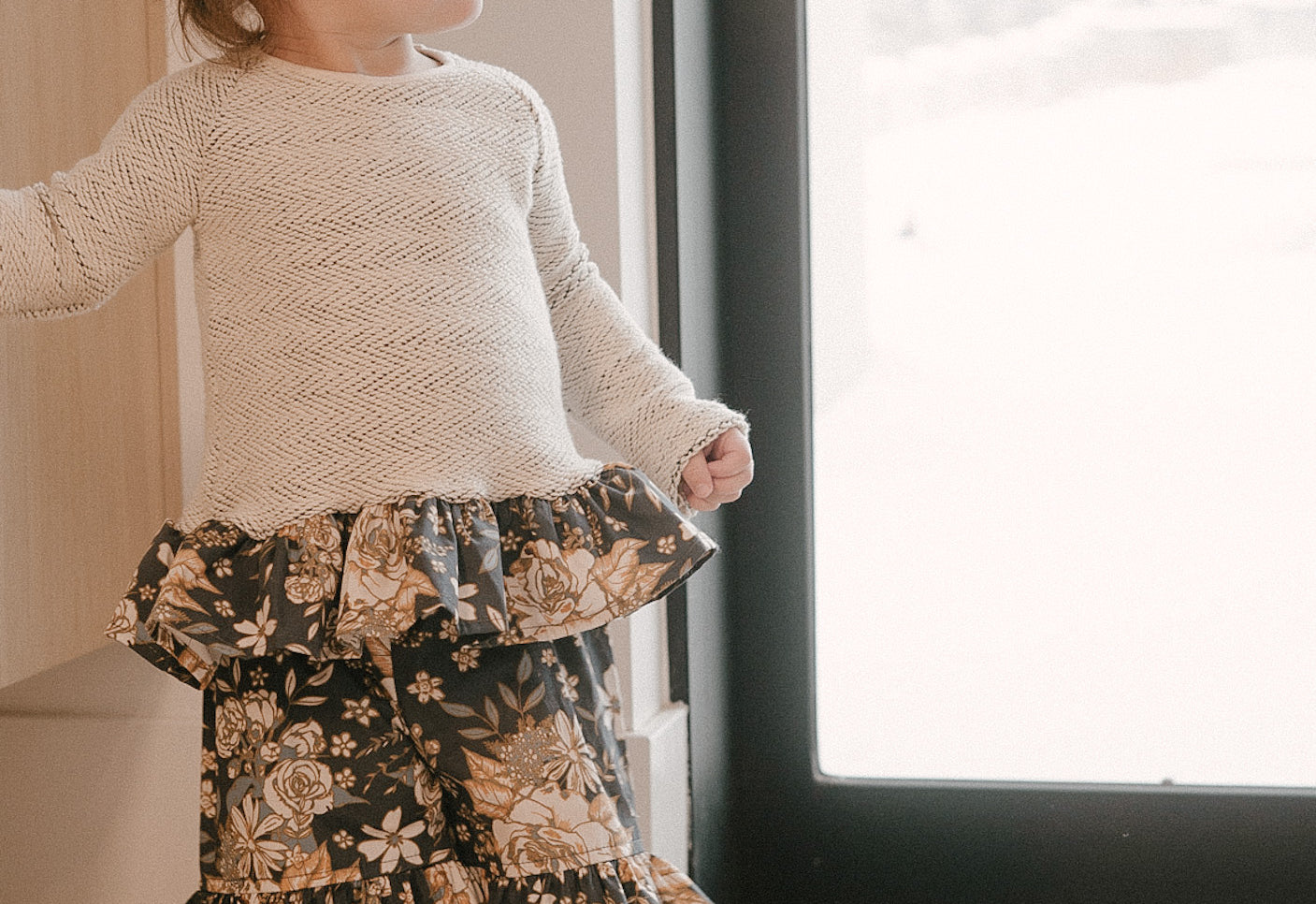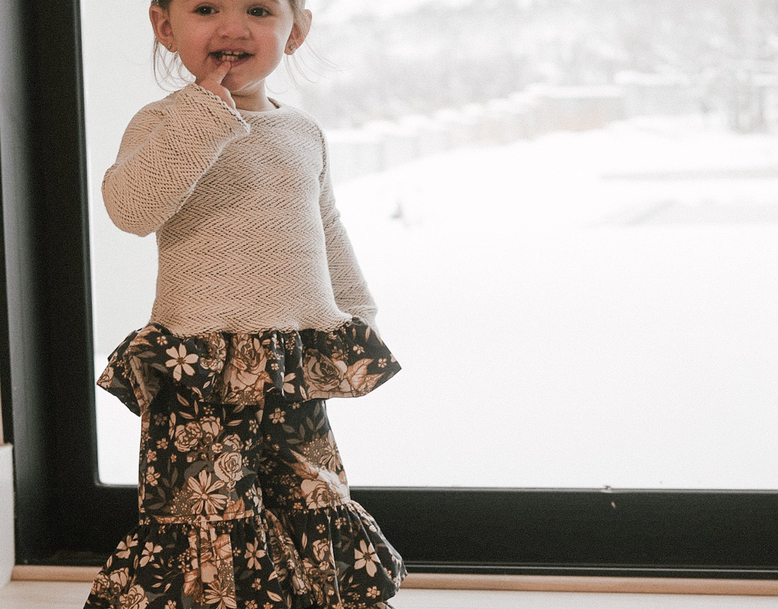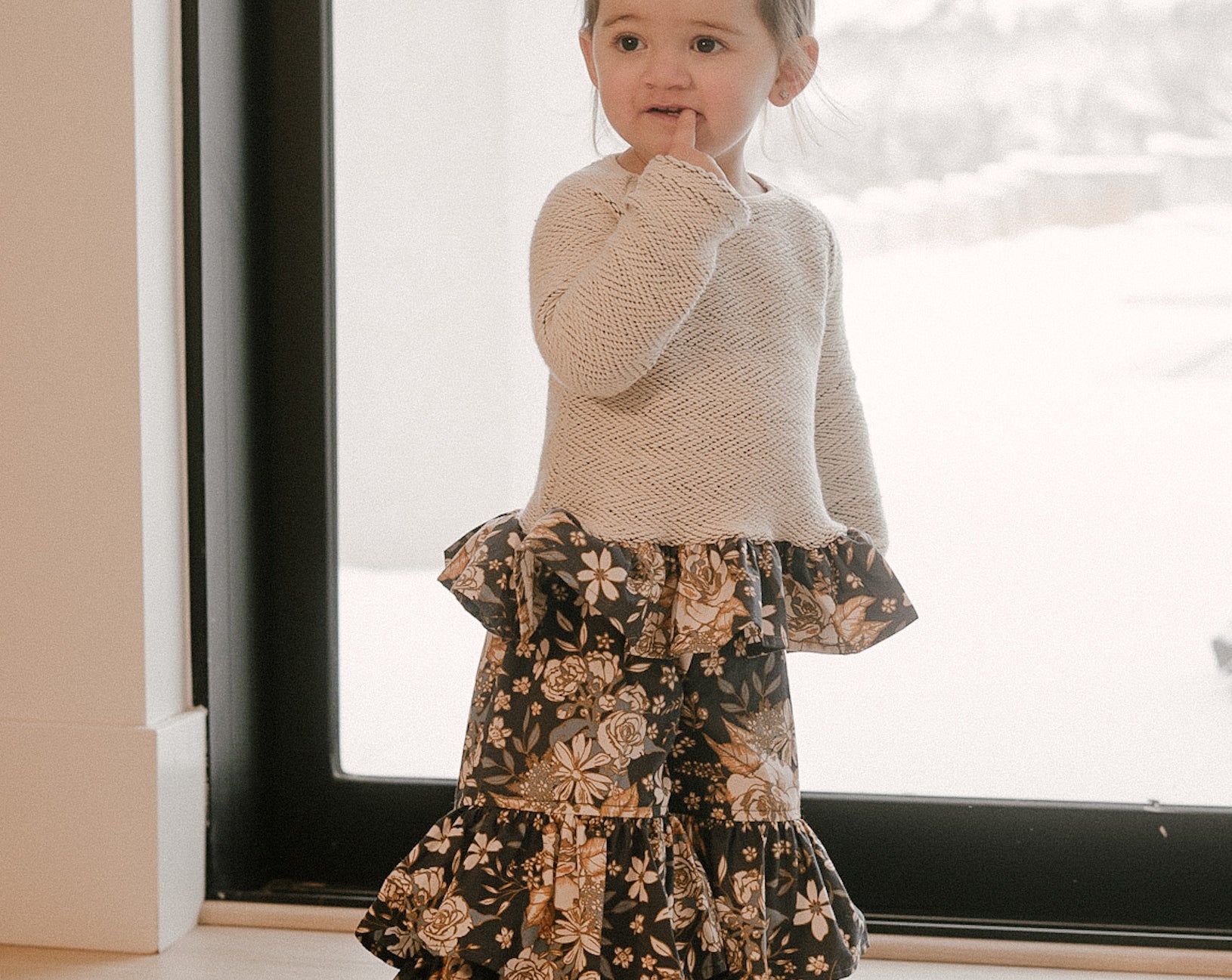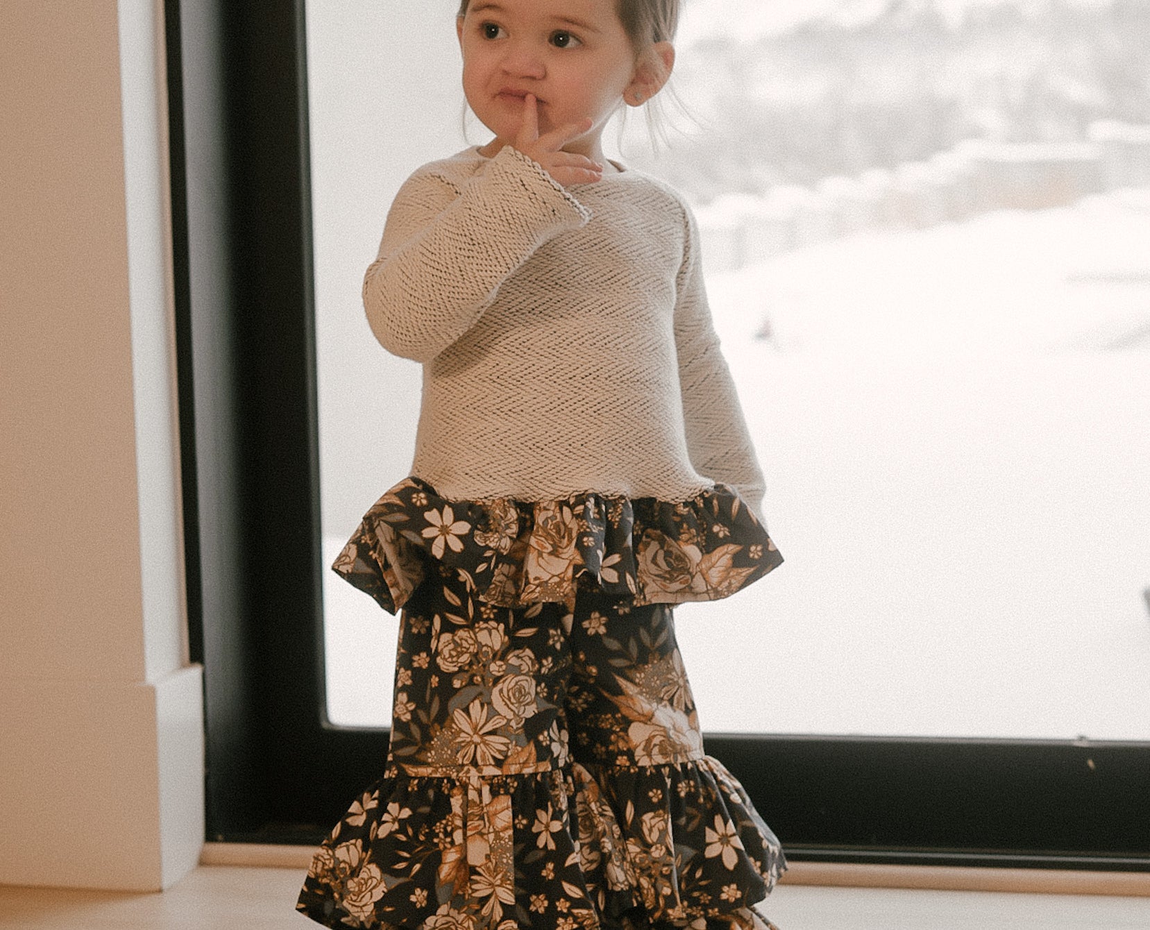 Who doesn't want to wear sweats with ruffles so you can be cozy + adorable!? The Playdate Top has the cutest raglan sleeve with a slight flair and a contrast neck binding. She is the perfect playdate outfit and especially when paired with the Erin Legging, Double Ruffle Belle Pant, or Palazzo Pant. You will love this one!