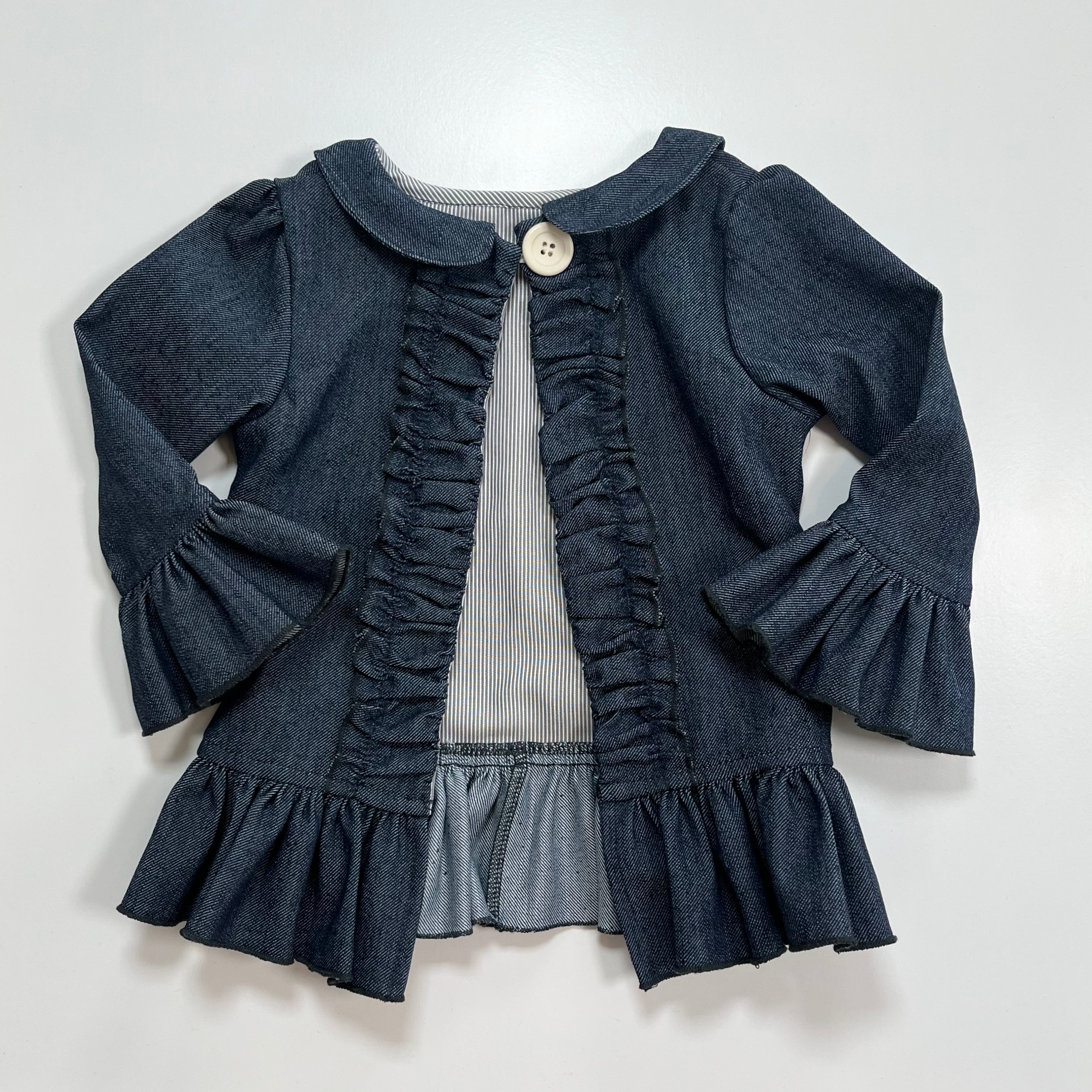 Our beloved Stella Jacket in Denim is the perfect jacket to go with just about anything in her wardrobe. It isn't any ordinary denim jacket, it has a ruching that goes down the front and a big button on the top. The bottom hem and sleeve has a gathered ruffle as well. Then when you look inside, you will see a cute stripe fabric for that extra pop of a detail. So much fun! I am so excited about the possibilities this jacket has in the collection creating so many looks. Note-This denim and the double ruffle denim aren't an exact match but work for sister looks.