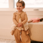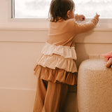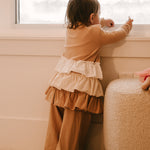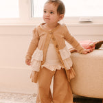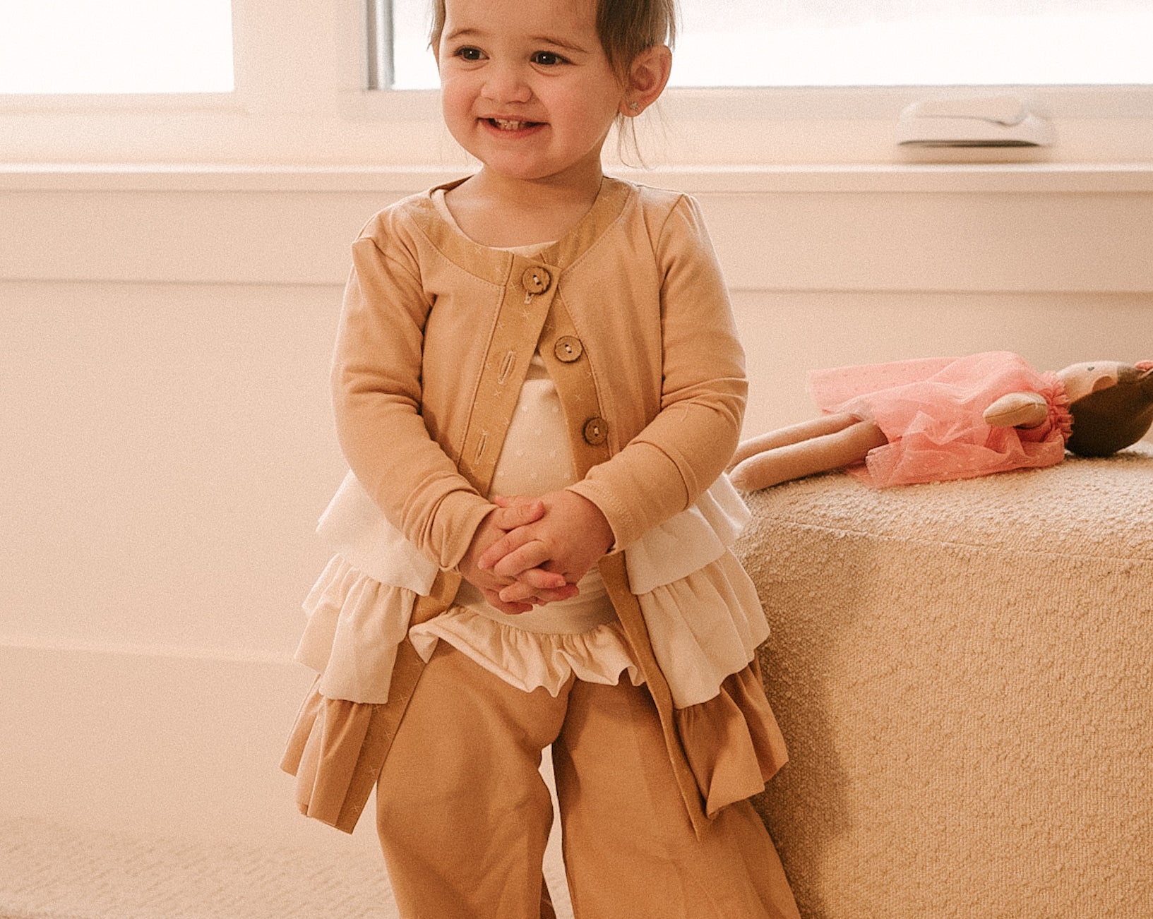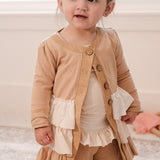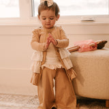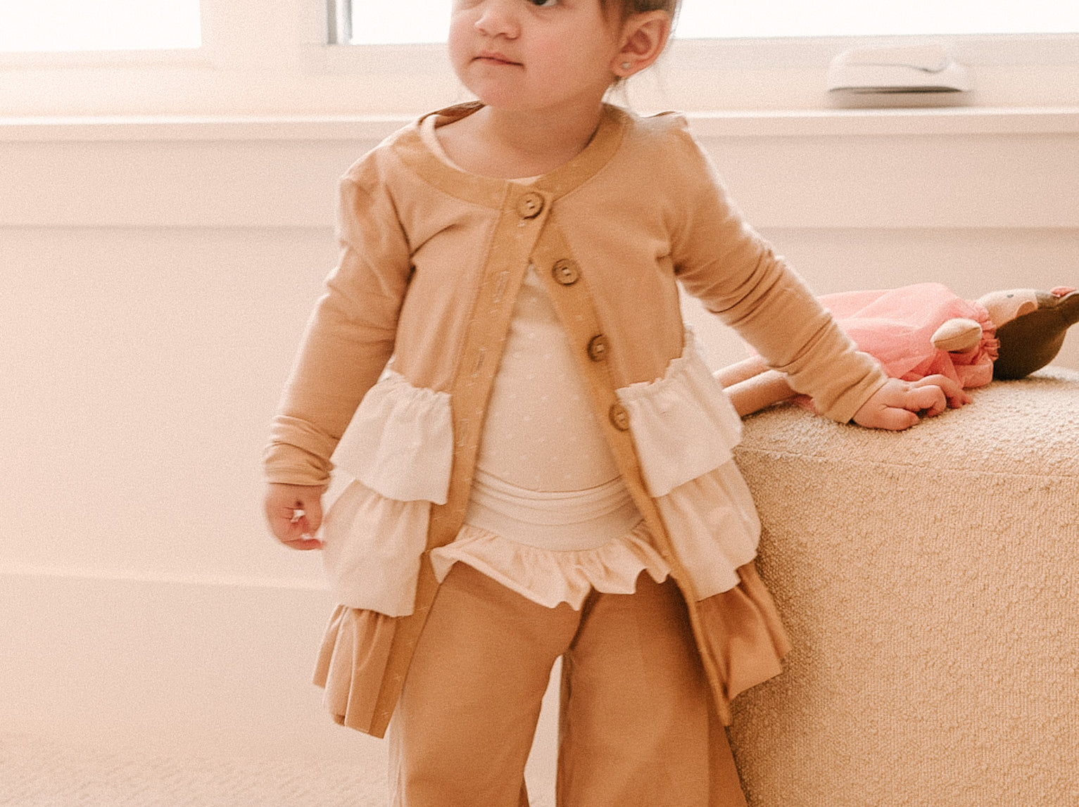 The Tess Jacket is such a fun jacket to layer over so many things in the collection. You will love this jacket! Pair with the Double Ruffle Belle Pant, Palazzo Pant, or the Erin Legging and put the Lou Lou Top, Aspyn Top, or Avery top underneath. This is made with a tan knit and 3 shade of cream ruffles.