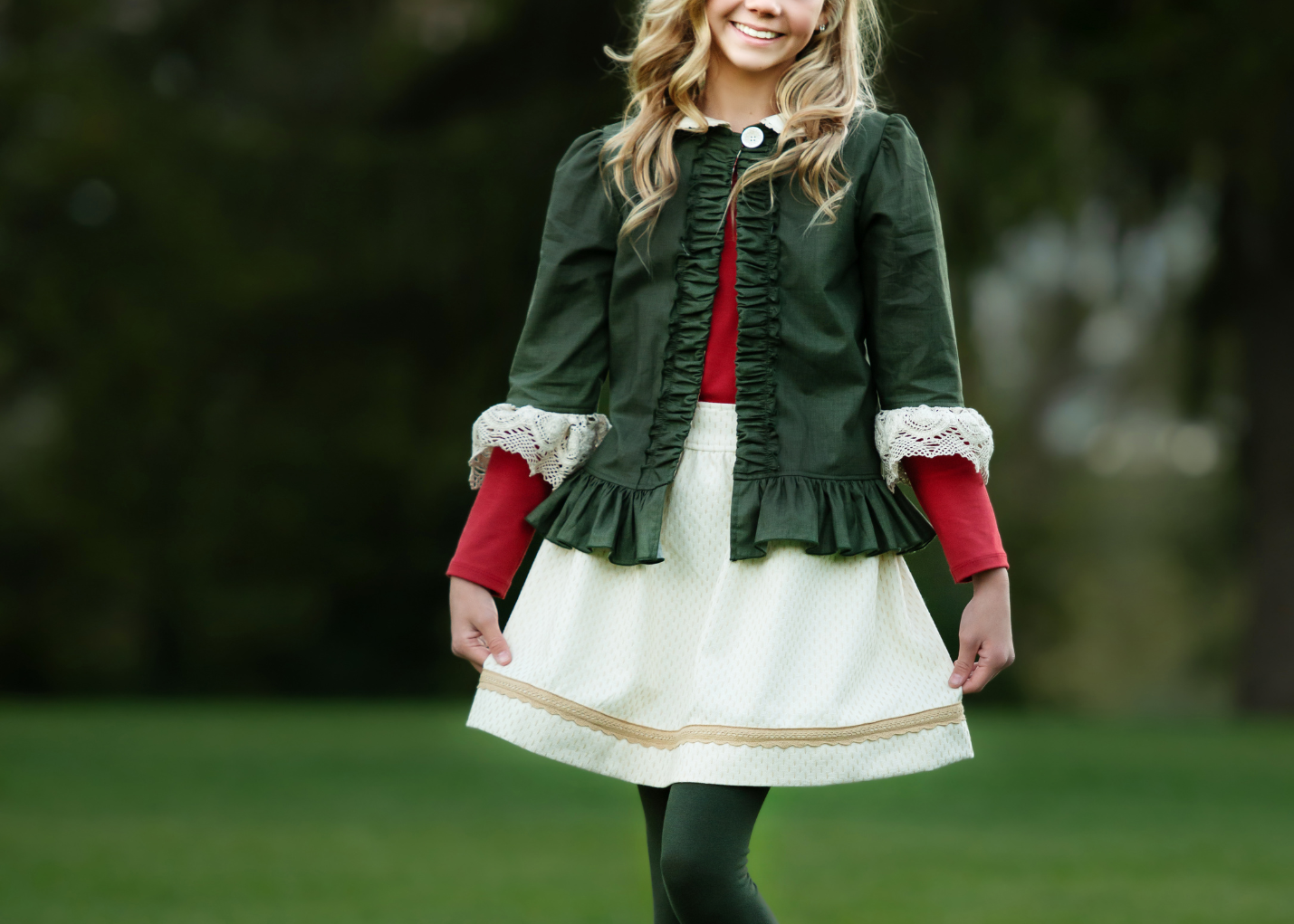 Gracie has lots of personality with her 3 gathered ruffles on the bottom of the leg. She fits snug, but not too tight. She layers perfectly with our patchwork dress and our Ruth Skirt/Stella jacket combo. She is soft and will keep her legs cozy warm this holiday season. Enjoy!