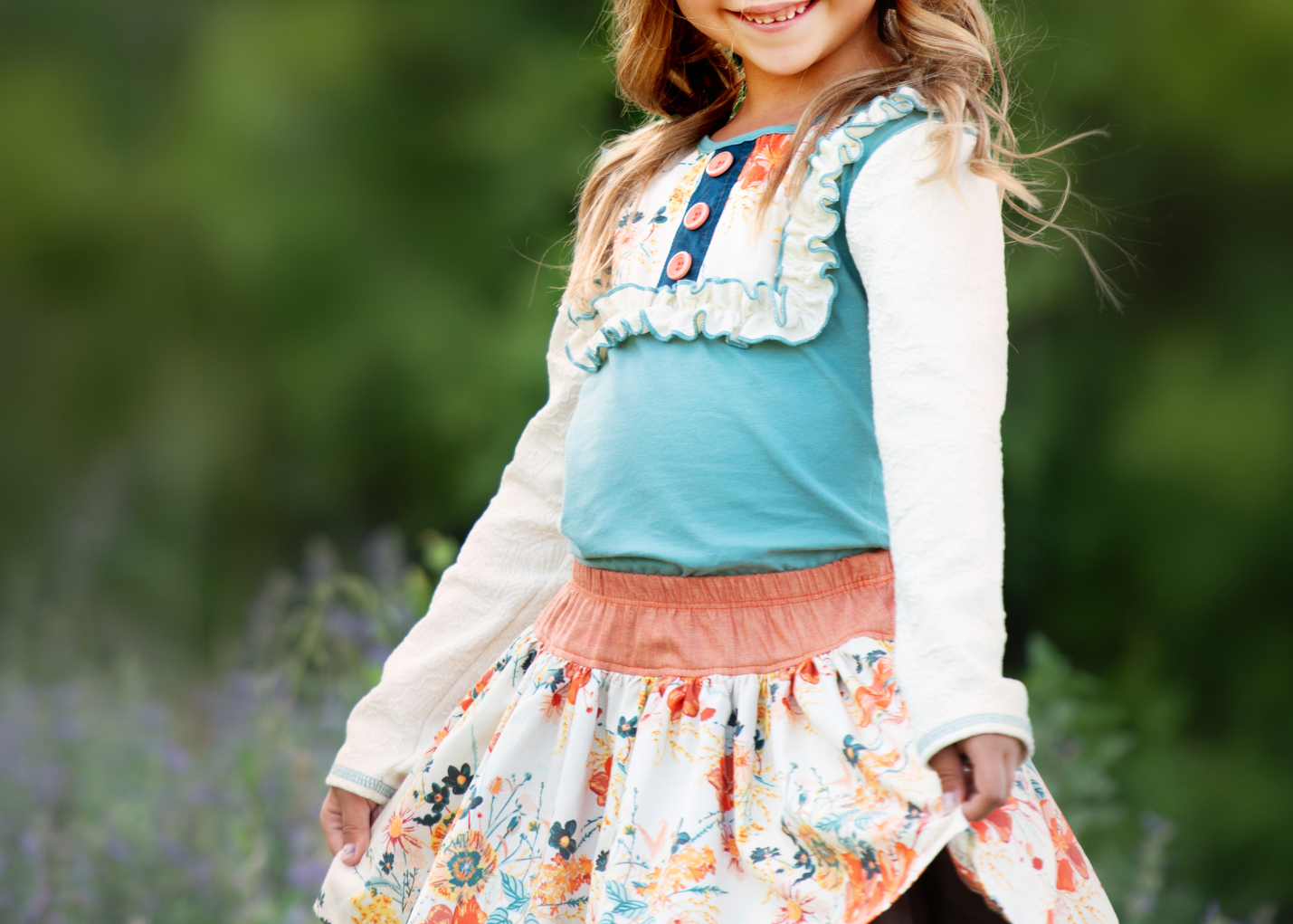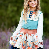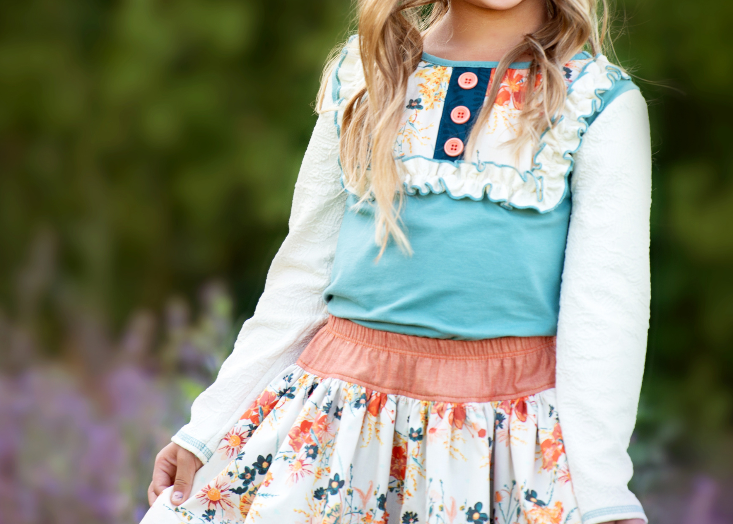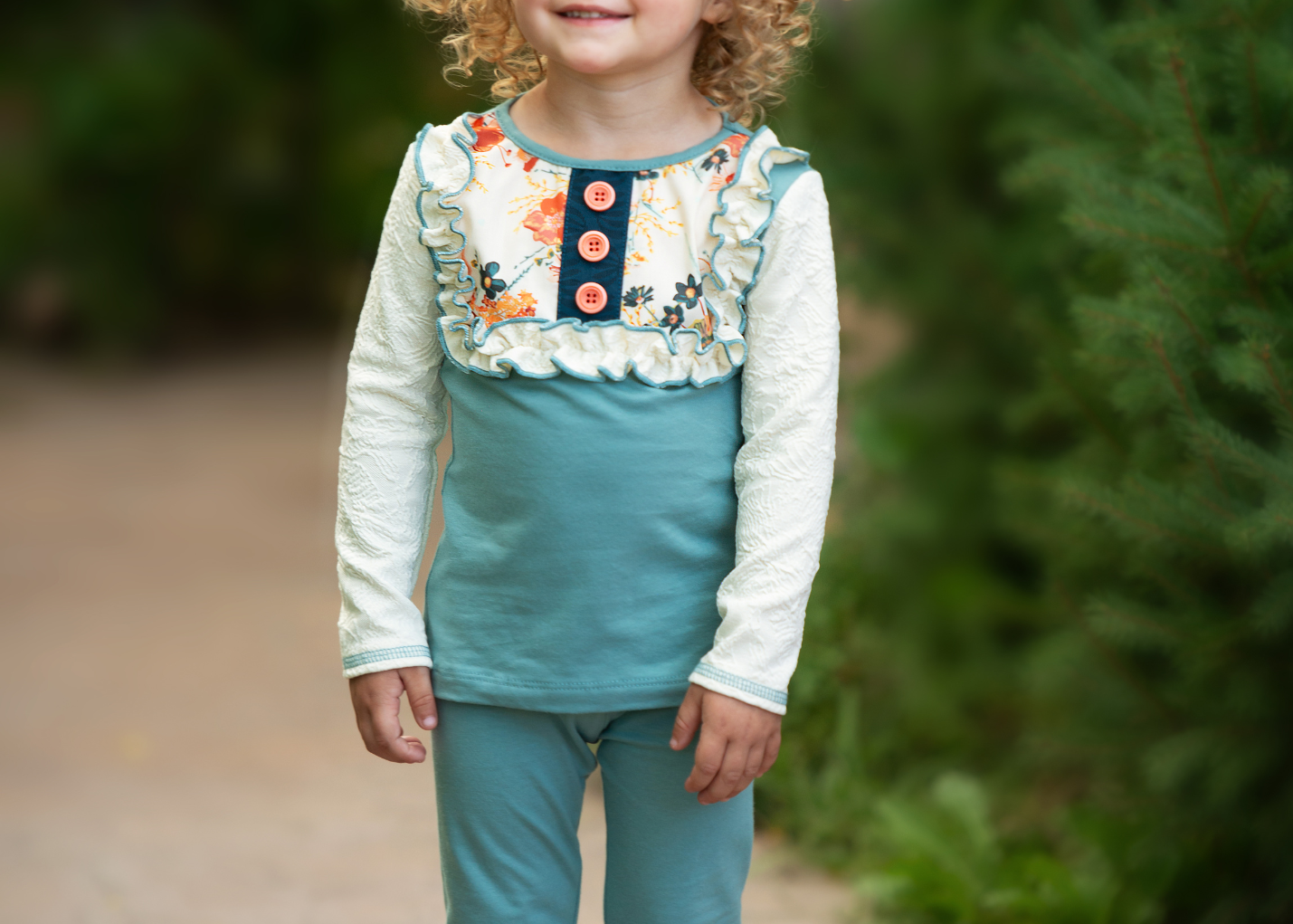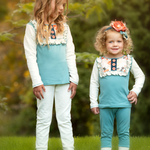 The Lou Lou Top has been our #1 best seller from the very beginning for good reasons. Where else can you find such an adorable and comfortable shirt that is so soft and full of so much personality? She pairs perfectly with our Kenley Legging and Lily skirt. You will love the contrast sleeve that matches the cuff on the Kenley legging in teal as well as matching the cream Kenley legging. We hope you are as excited as we are to have Lou Lou back in the market place! :)